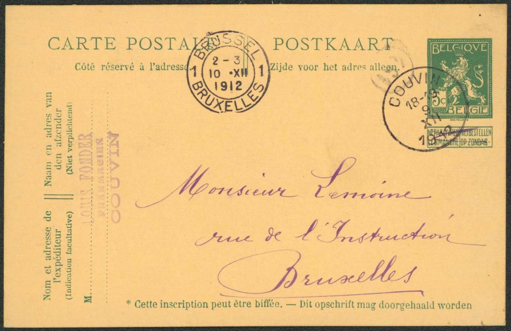 EP au type 5ctm vert Pellens obl simple cercle "Couvin" > Bruxelles / Pharmacien "