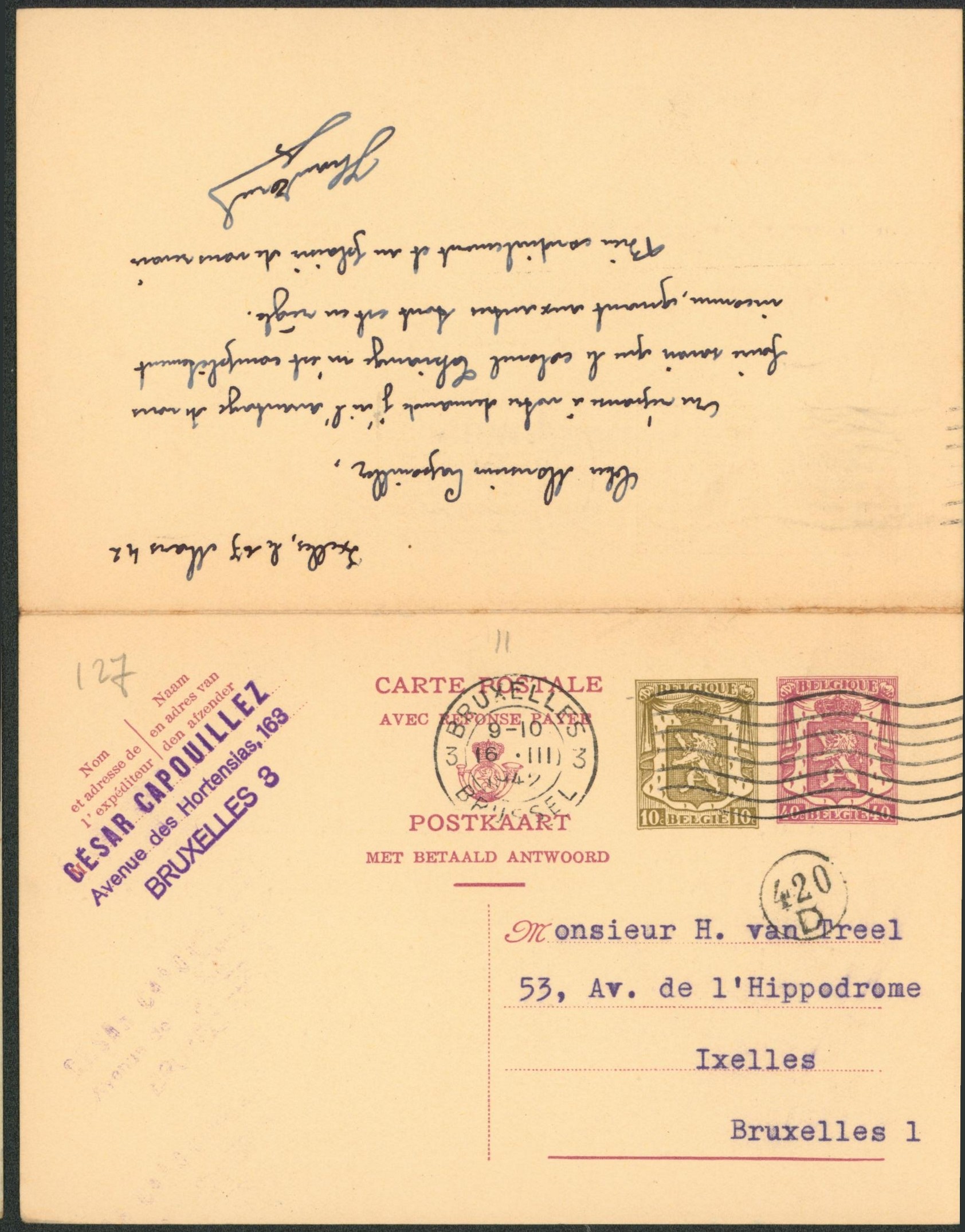 EP (double) au type 40C + 10C petit sceau (SBEP n°122FN) de Bruxelles > Ixelles + retour. Complet, TB