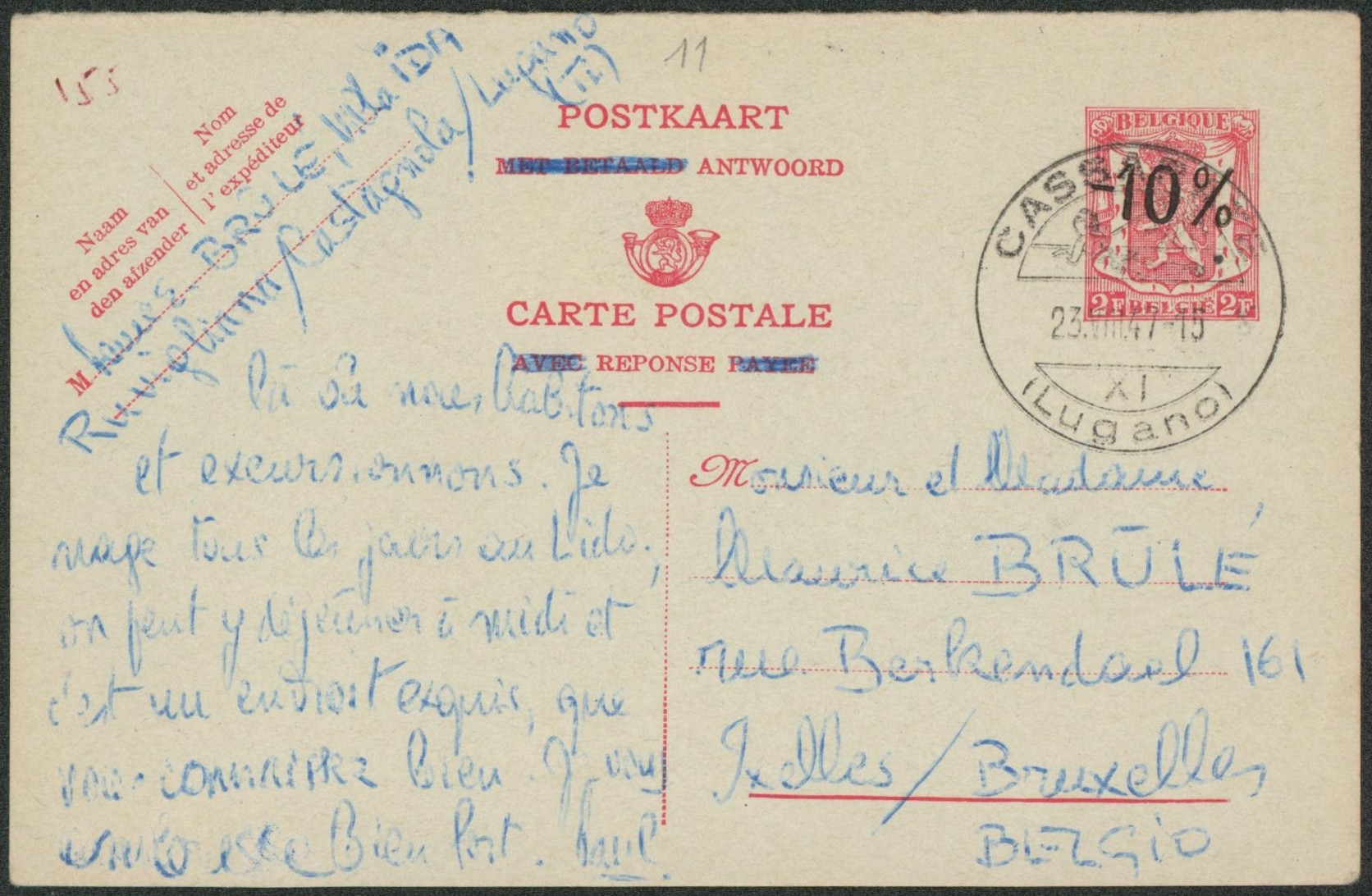 EP (réponse) au type 2F rouge petit sceau surcharge -10% expédié de Castagnola (Lugano, Italie) > Ixelles.