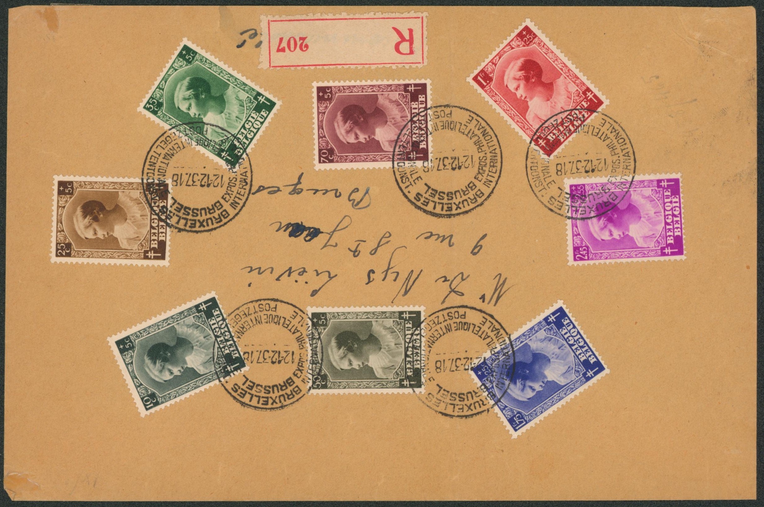 Série complète - n°458/465 sur lettre en recommandé de Bruxelles (exposition philatélique internationale) > Bruges