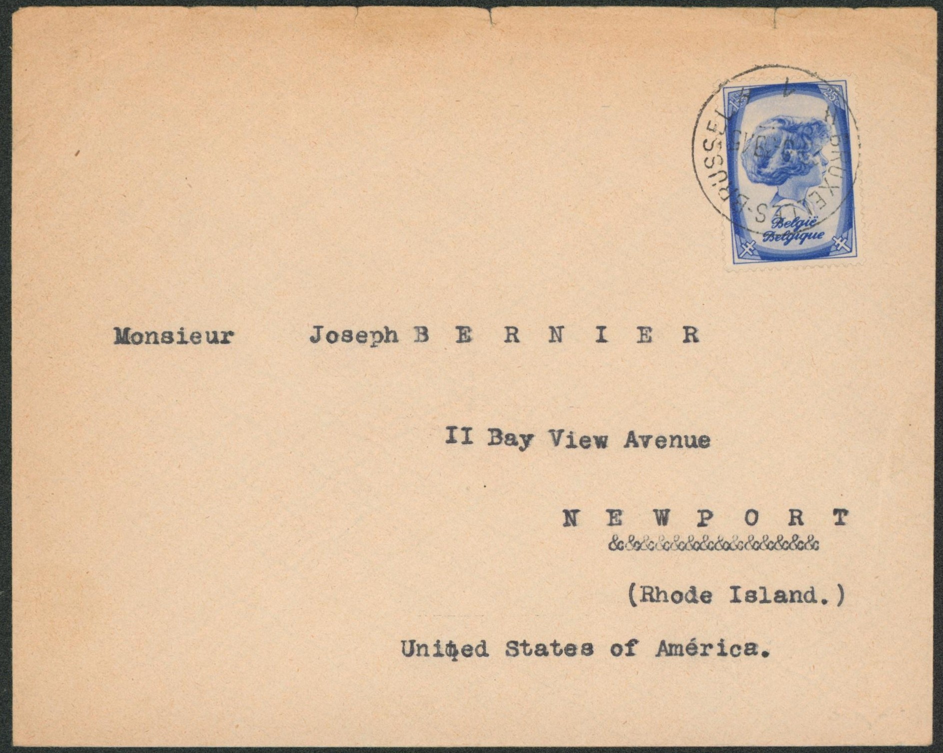 n°493 sur lettre expédié de Bruxelles > Newport (Rhode Island)
