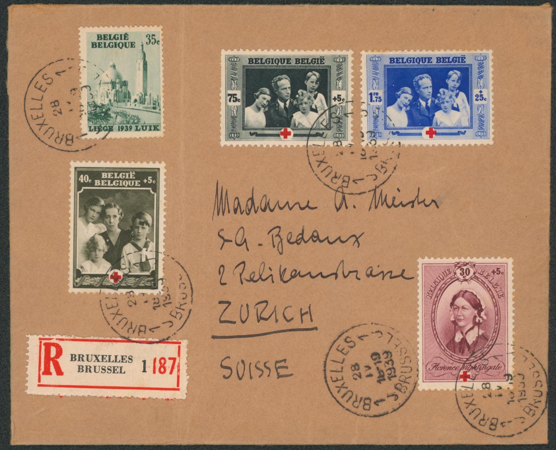 Affranch. Mixte (croix-rouge) sur lettre en recommandé de Bruxelles > Zurich (Suisse).