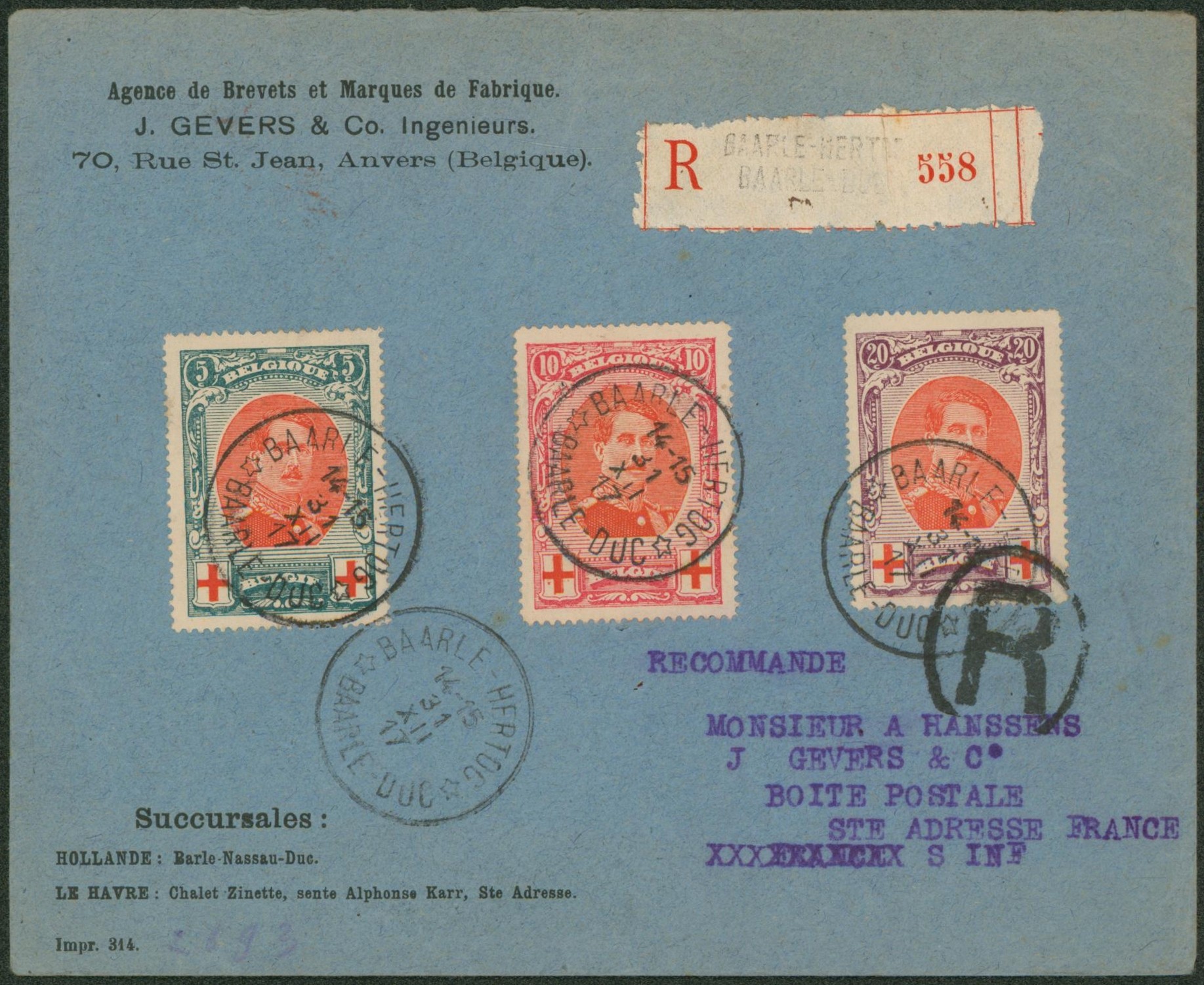 Croix-rouge - n°132/34 sur lettre en recommandé de Baarle-Hertog > Ste-Adresse.
