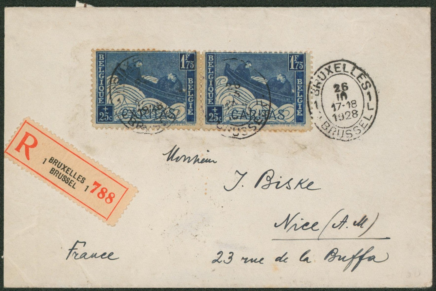 Caritas - n°252 en paire sur lettre en recommandé de Bruxelles > Nice