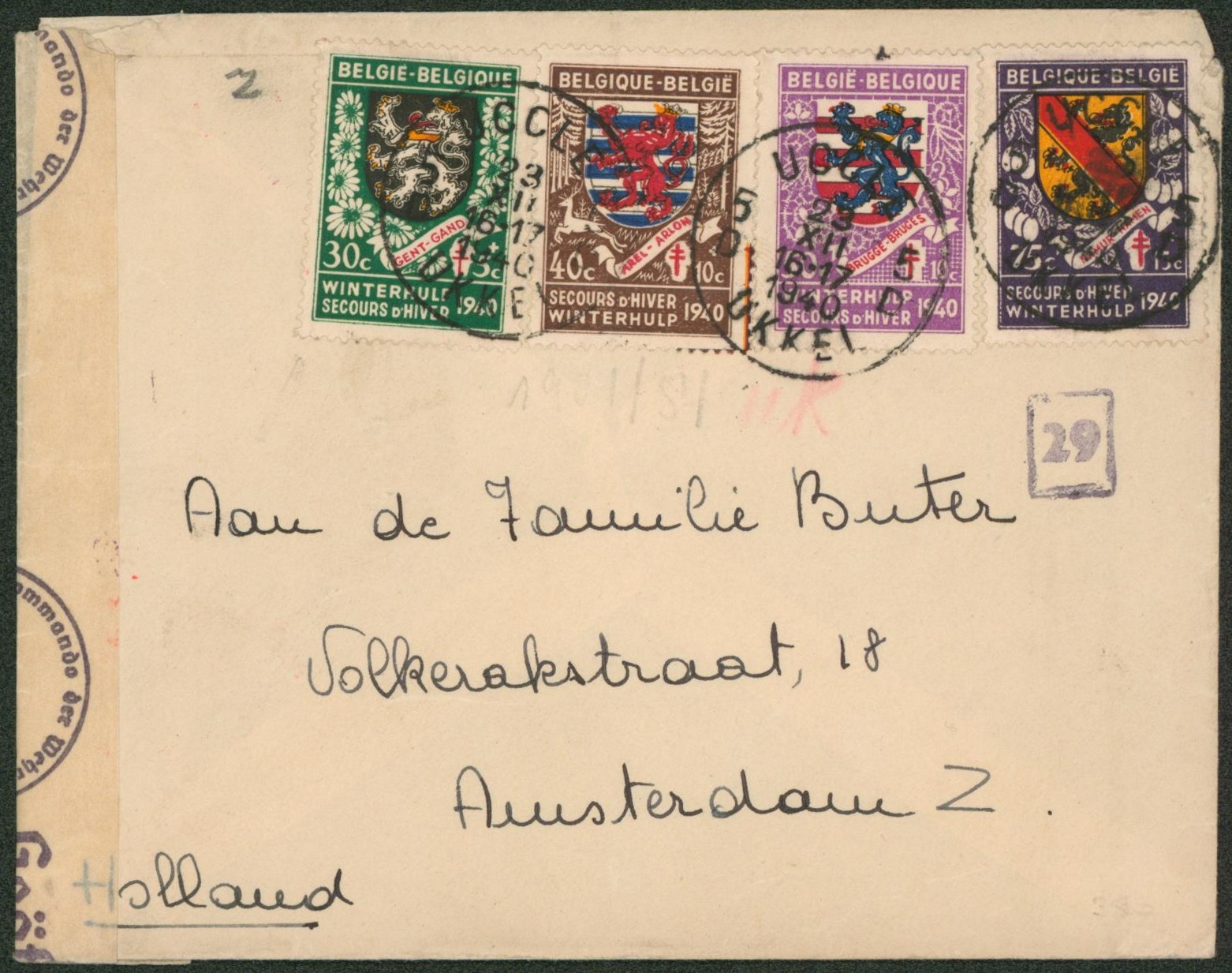 Secours d'hiver - Affranch. Quadricolore sur lettre expédié de Uccle + Bandelette de censure > Amsterdam