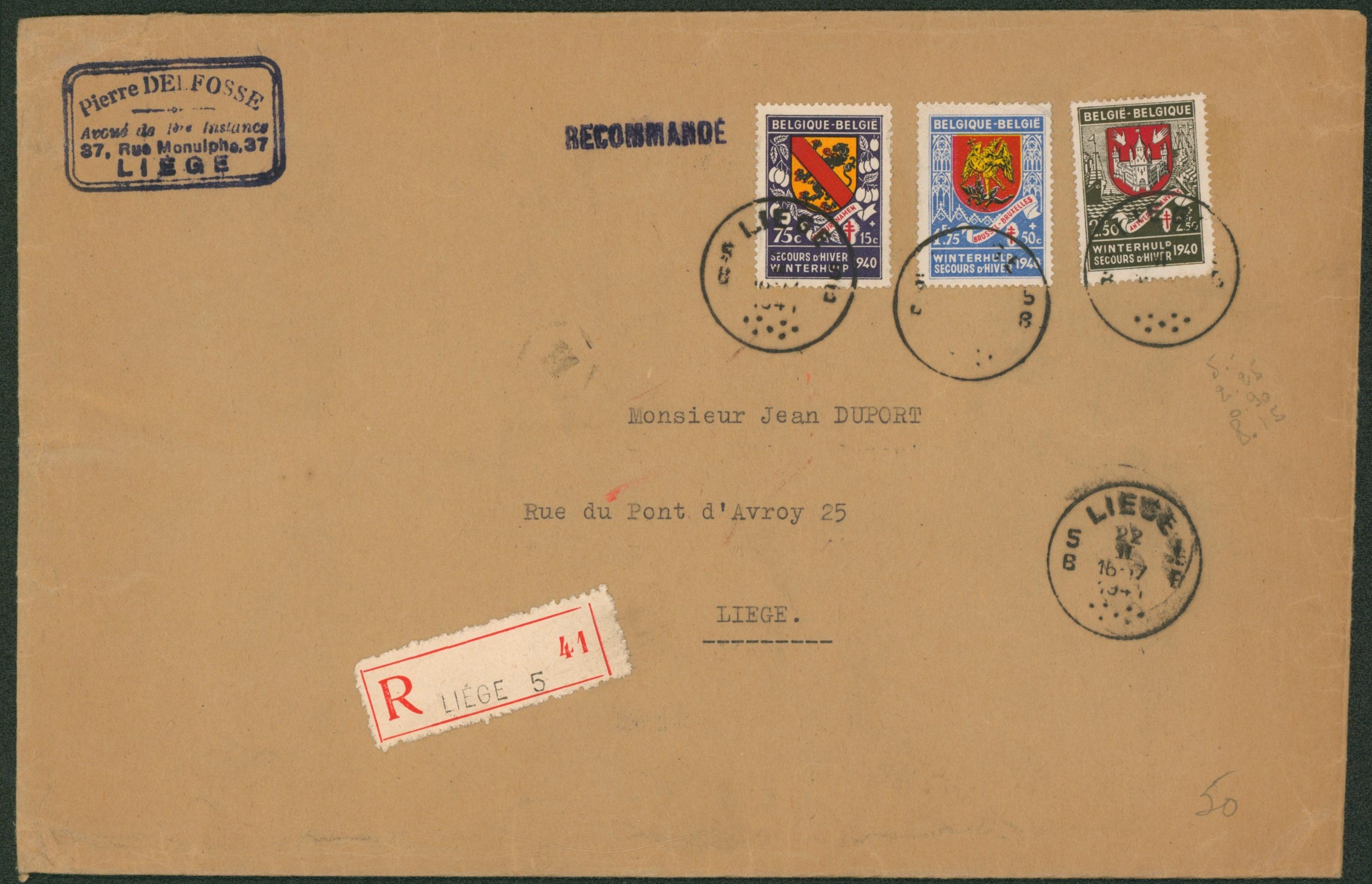 Secours d'hiver - Affranch. Tricolore sur grande env. en recommandé de Liège 5 > Liège