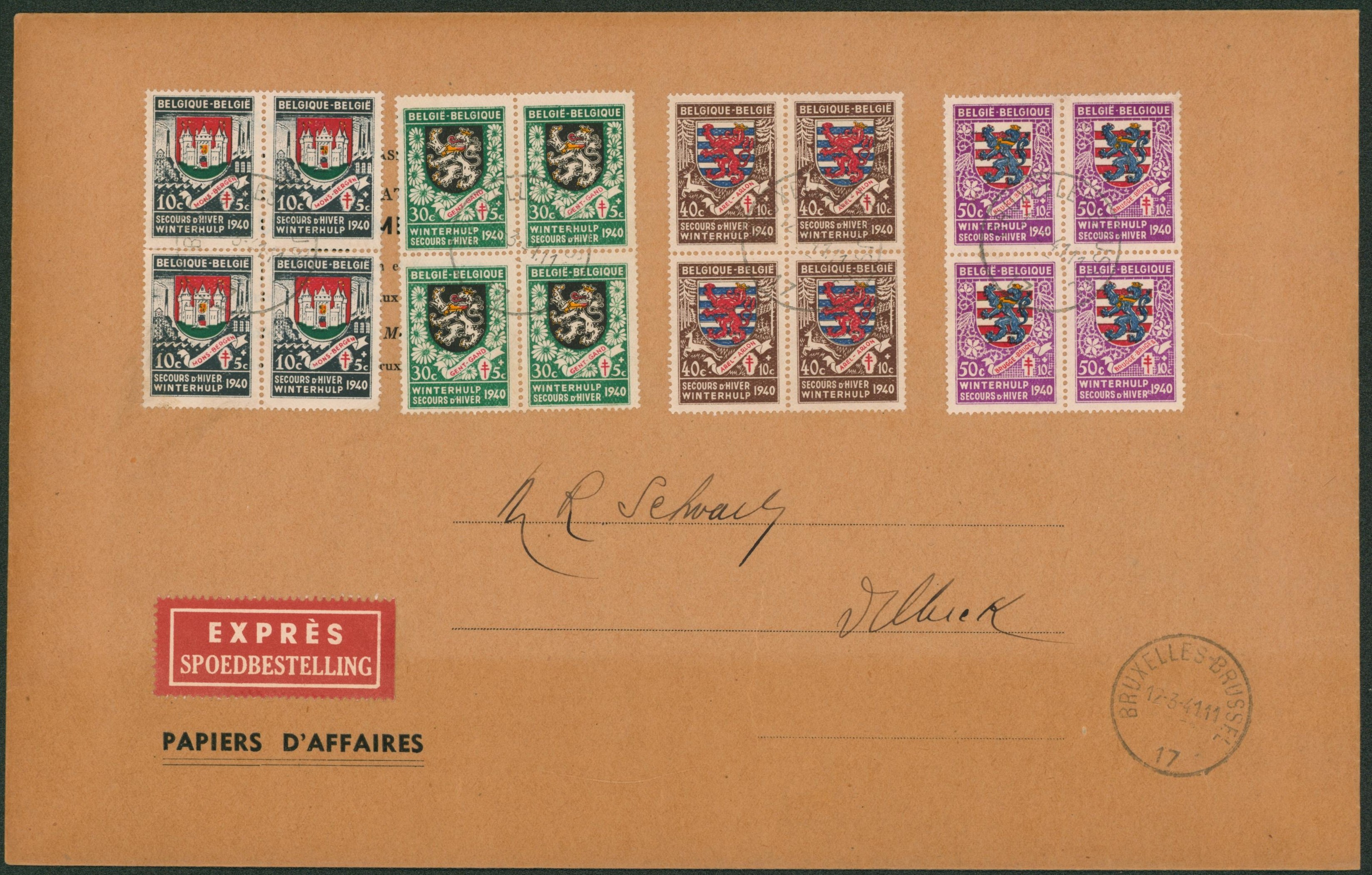 Secours d'hiver - 4 bloc de 4 sur grande env. en expres de Bruxelles > Wilriek / papiers d'affaires