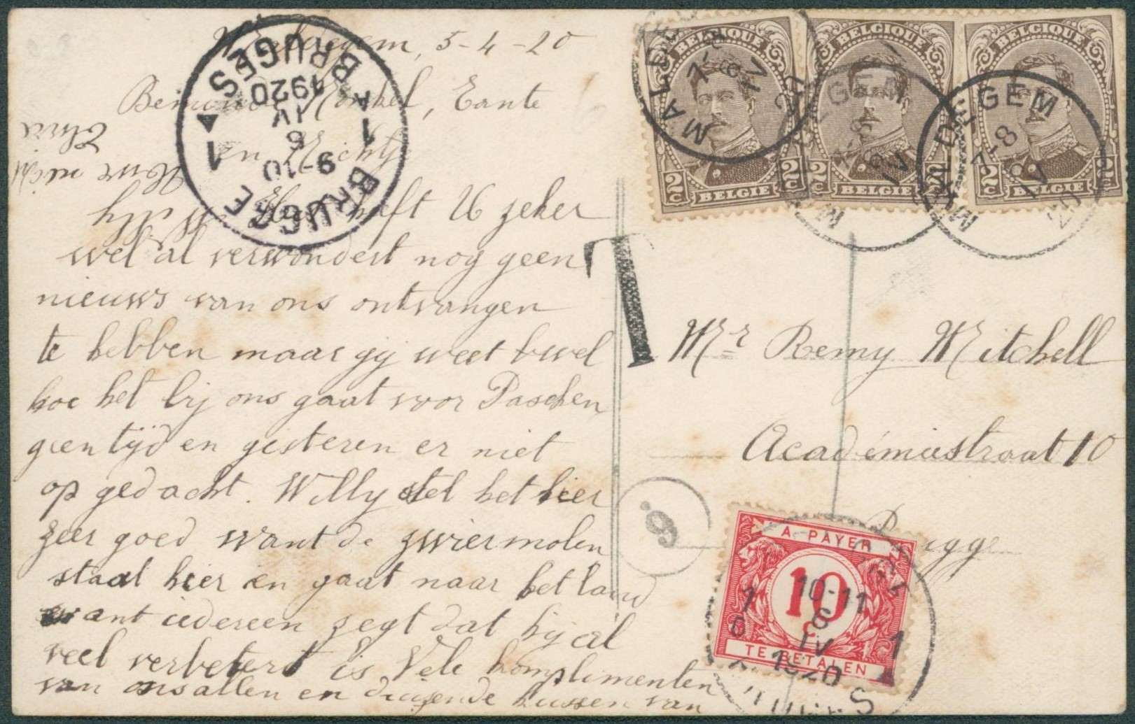 n°136 x3 sur CP fantaisie expédié de Maldegem (1920) > Brugge / Bruges, taxé à 10ctm !